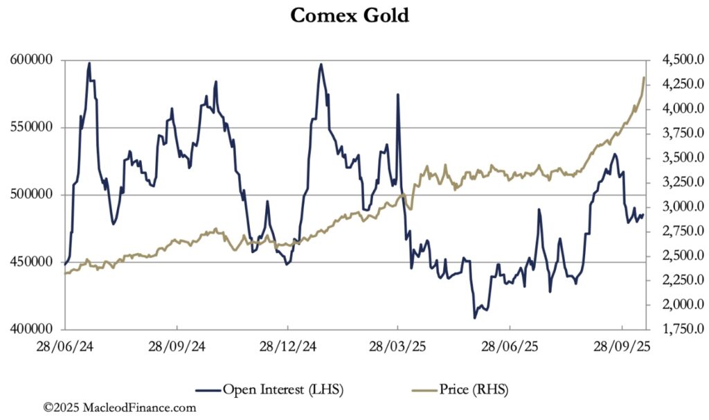 Note how there have been periods of falling open interest while the price has continued to rise. Rather than a rising price being driven by increased buying which is the normal relationship, there are times when open interest has contracted on a rising price. These can only be due to the swaps (mostly bullion bank trading desks) on Comex discouraging buyers by raising prices. It is particularly noticeable since mid-September, following which open interest fell significantly while the price has soared.