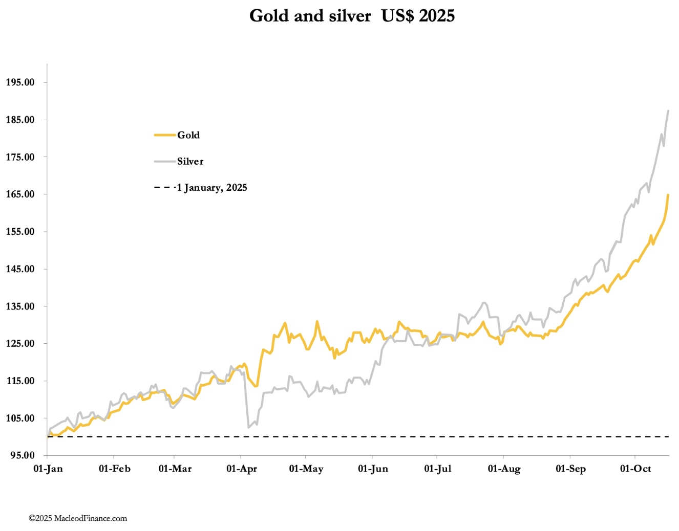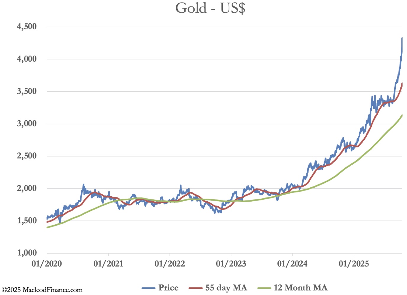 Gold and silver have had a rip-roaring week with their prices rising almost vertically. In European morning trade, gold was $4340, up $320 from last Friday’s close. And silver at $54 was up nearly $4. Adding to the sense of a gathering run on bullion stocks, reports from around the world are of queues of retail buyers no longer worried by high prices but seeking to buy small bars and coin in both metals before prices go even higher.